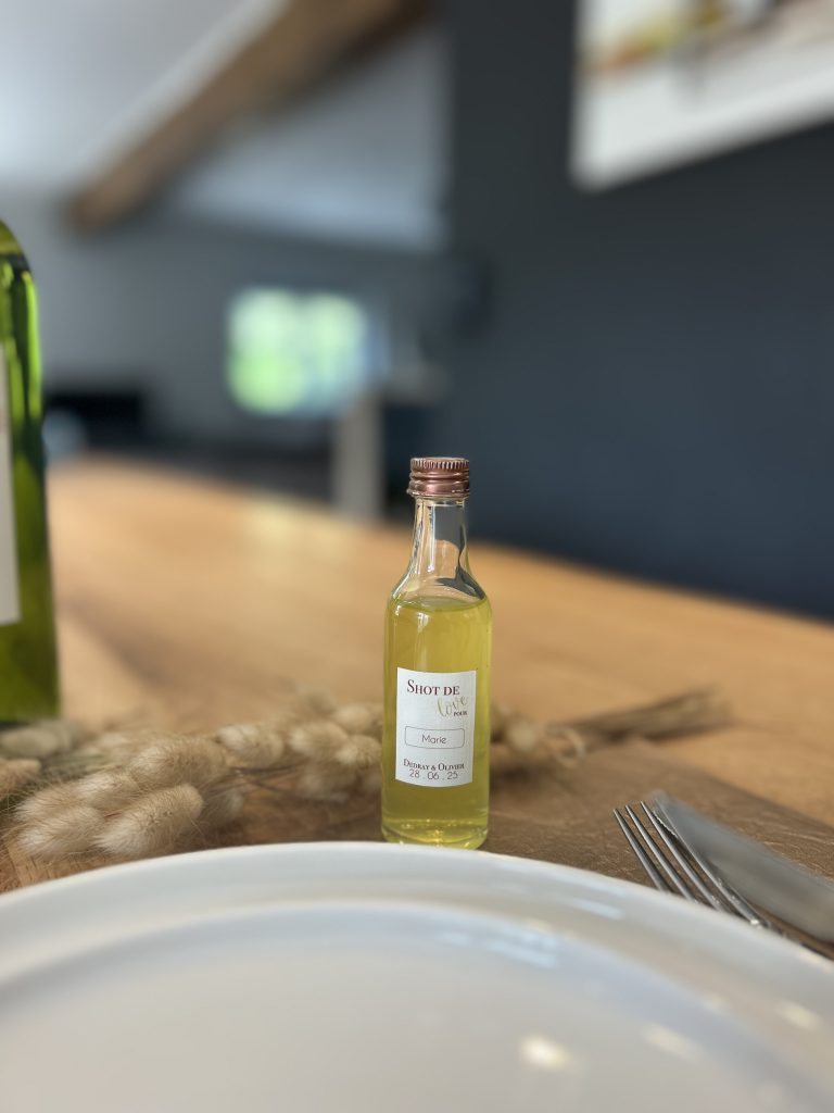 Un menu et des nominettes en stickers, c’est l’alliance parfaite entre praticité, esthétisme et originalité. Collés directement sur une bouteille de vin ou sur une petite fiole d’alcool, ils apportent une touche élégante et personnalisée à votre table, tout en devenant un souvenir à emporter pour vos invités. Un double emploi astucieux, qui permet une petite économie non-négligeable sans rien sacrifier au raffinement.